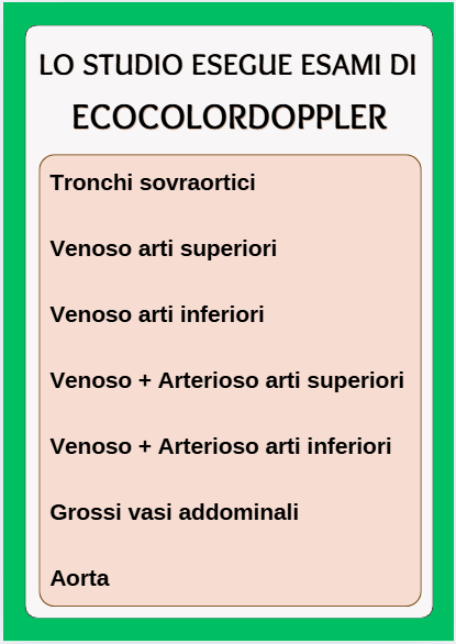 In particolare si eseguono i seguenti esami di diagnostica ecografica: capo e collo, mammella, addome superiore, reni e surreni , addome inferiore, addome completo, cute e tessuto sottocutaneo, apparato osteoarticolare e muscolo-tendineo, arti superiori e arti inferiori.